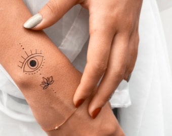 Fine Line Evil Eye Und Lotusblume Temporares Tattoo 3er Set Etsy De